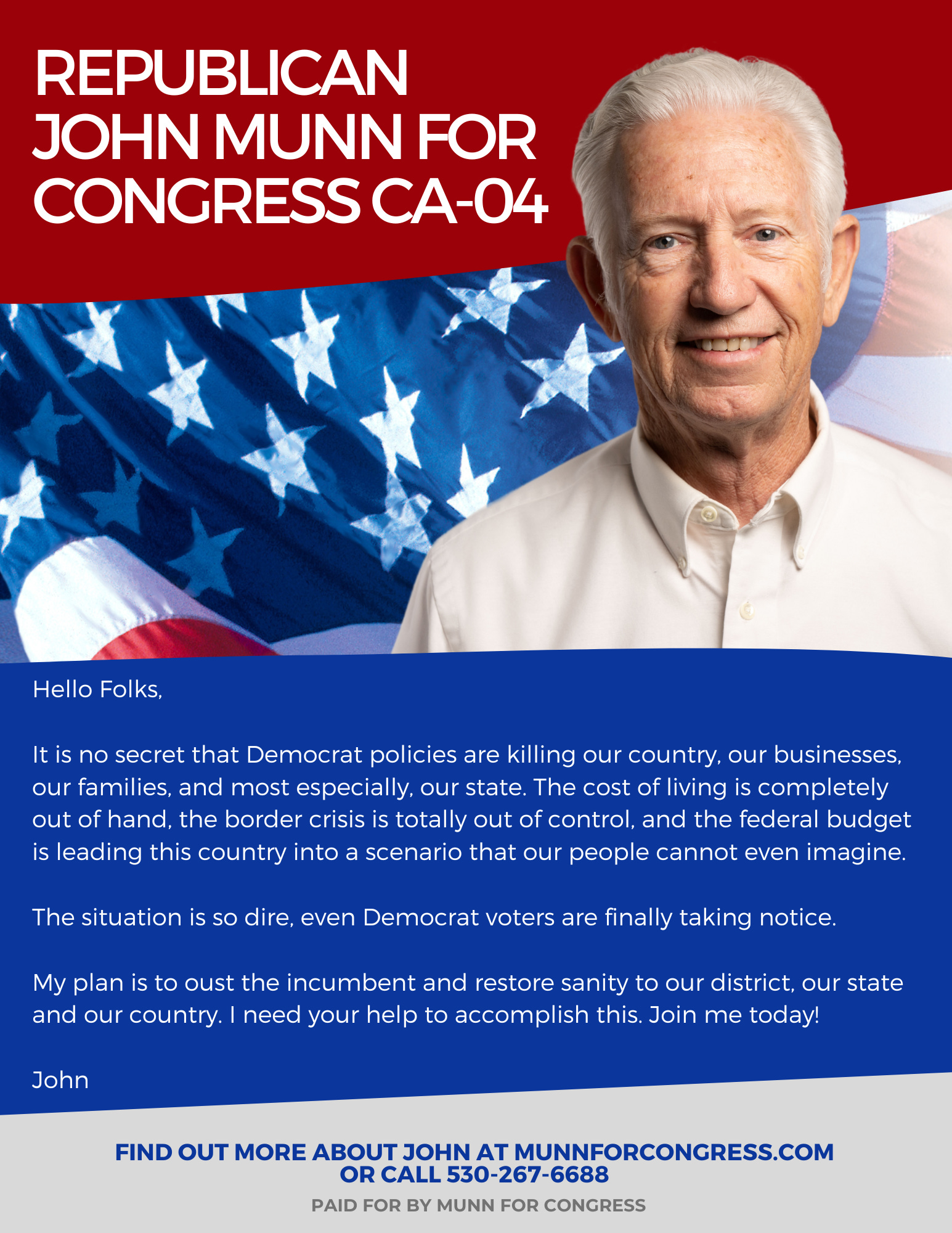 I’m John Munn, from Davis, and I am running for Congress. We need to stop the insanity in California. Please join my new Facebook page, my new Twitter page and my website. You can click here to download a pdf version of my printable flyer, please share with your friends!